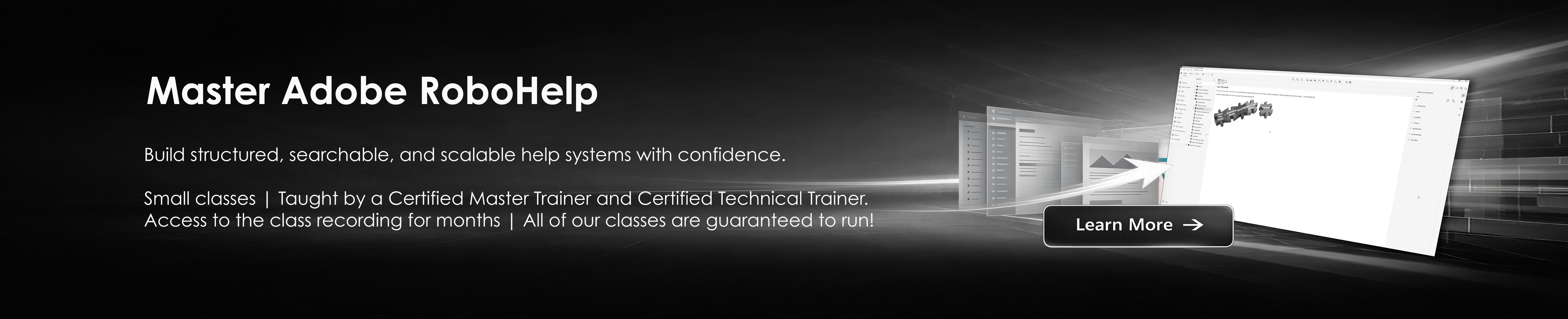 "Thank you for the great Adobe RoboHelp training class last week. I learned more than I expected to. You have a unique knack for keeping everyone engaged and entertained while teaching content and technique. I thoroughly enjoyed the class!"